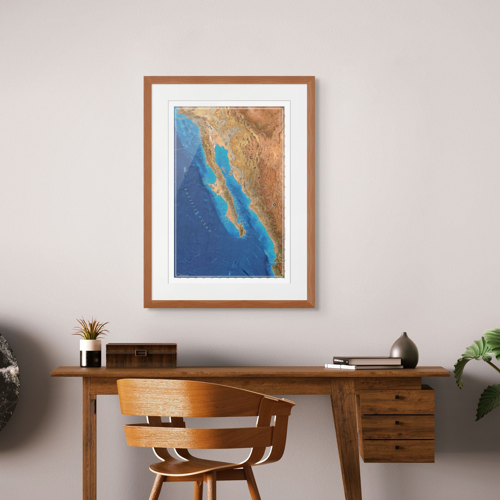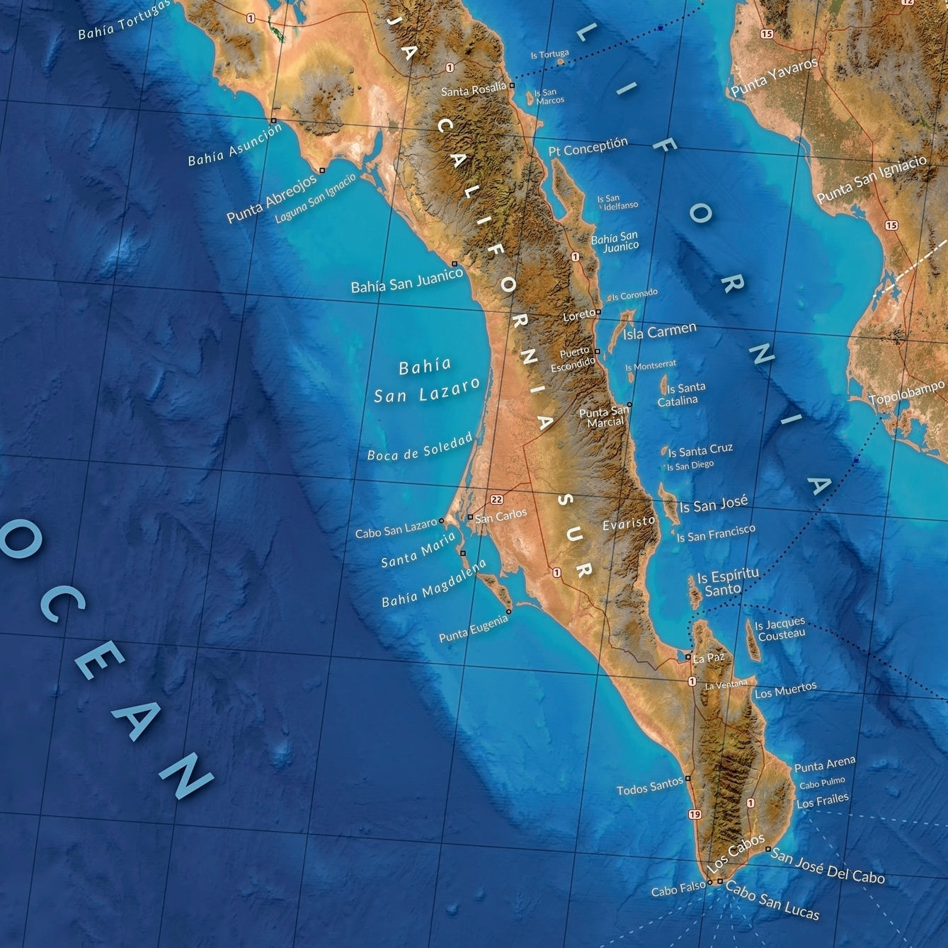 This is an ocean focused wall map of Baja and the Sea of Cortez. Coloured like the desert smashing into the deep blue sea, and labeled with the clarity of a nautical chart.